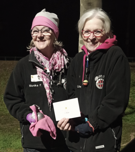 Tiefer, nasser, frisch abgezogener Kiesboden ließ uns gut ins Spiel gegen Nadine Egenolf von den PC Bouletten Mannheim und Sonja Teske vom TSV Badenia Feudenheim kommen. Monika und ich waren hochkonzentriert, auch wenn wir bereits 9 Stunden auf dem Platz standen. Monikas Kugeln fanden immer das Cochonnet und wenn eine generische Kugel im Weg lag, wurde sie von mir weggeschossen. Mit einem 13:2 erreichten wir den 1.Platz im C-Turnier. Überglücklich lagen wir uns in den Armen. Monika und ich waren nach Feudenheim gefahren, um nette Menschen zu treffen, Spaß und schöne Spiele zu haben. Gewonnen haben wir auch.