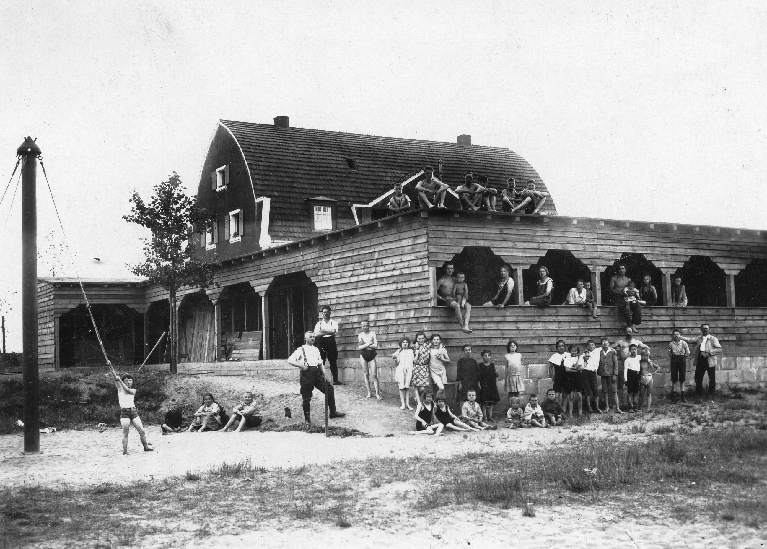Der Antrag für den Baubeginn eines Vereinsheim wird gestellt. Das Bild zeigt das fertige Vereinsheim und Umkleiden im Jahr 1925.