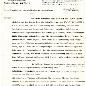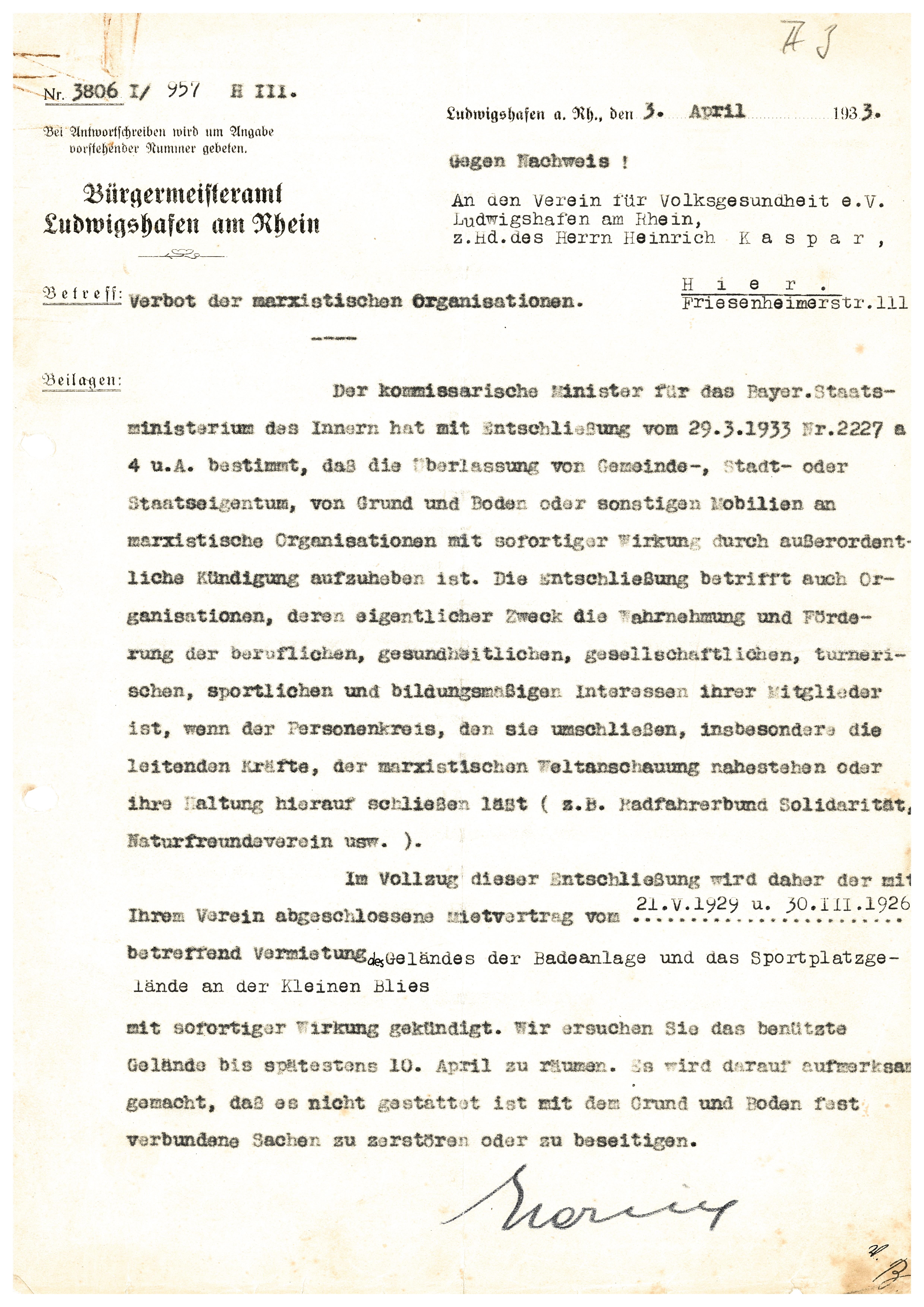 Nach den Reichstagwahlen vom 05. März 1933 wurden unzählige Vereine, Gewerkschaften und sonstige Organisationen verboten. Alleine im damaligen Stadtgebiet von Ludwigshafen wurden insgesamt 205 auf einen Streich. Darunter auch der Verein für Volksgesundheit e.V. Wenige Monate später wird das gesamte Vereinsvermögen eingezogen und dem Land Bayern zugeschlagen.
